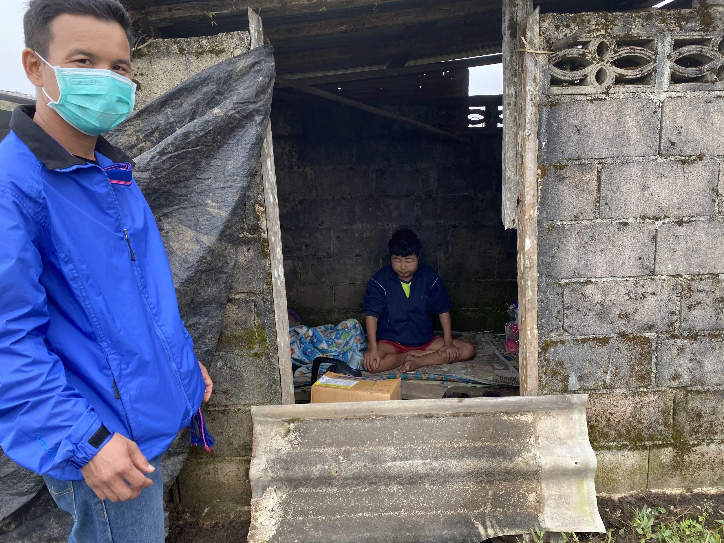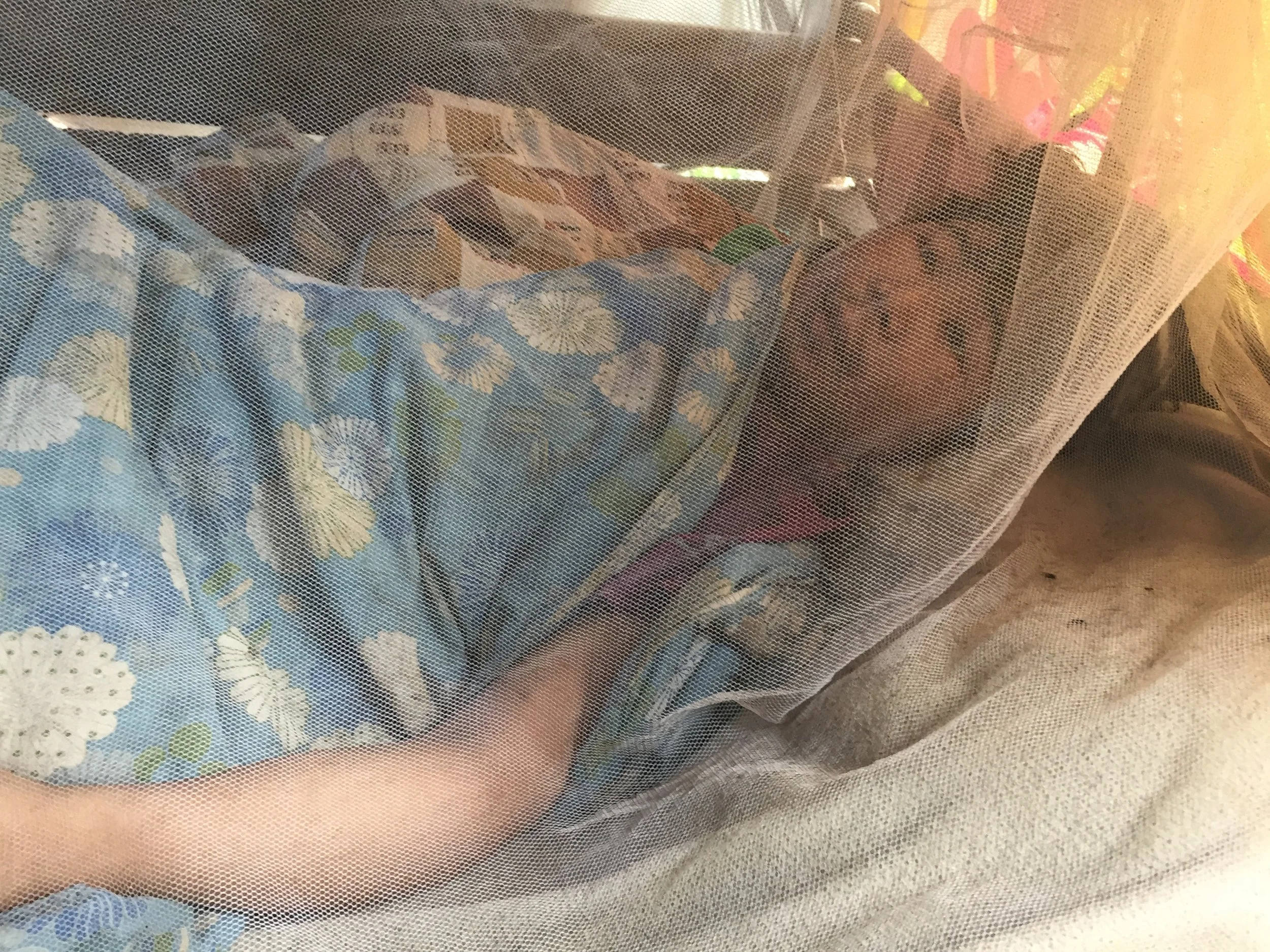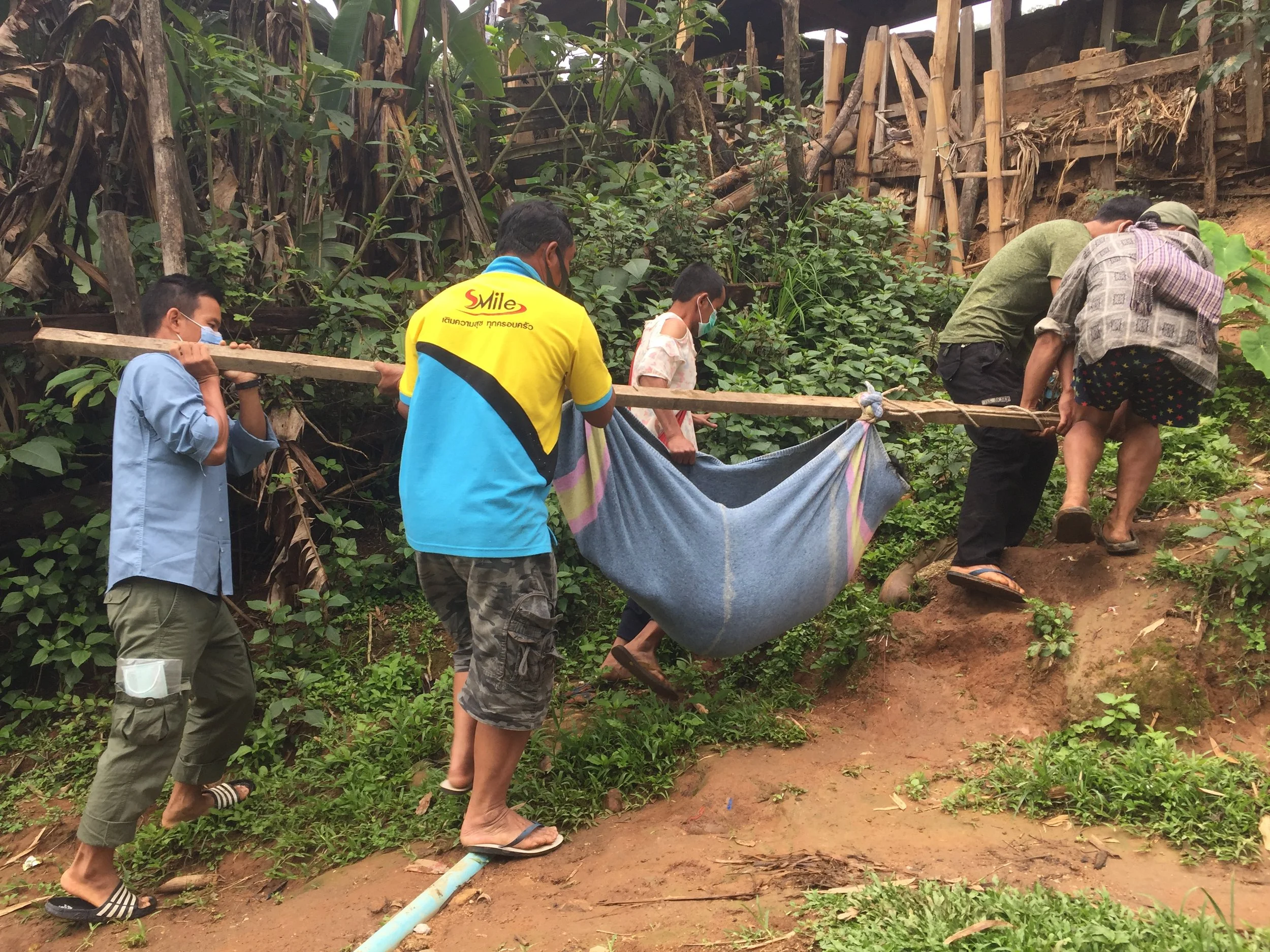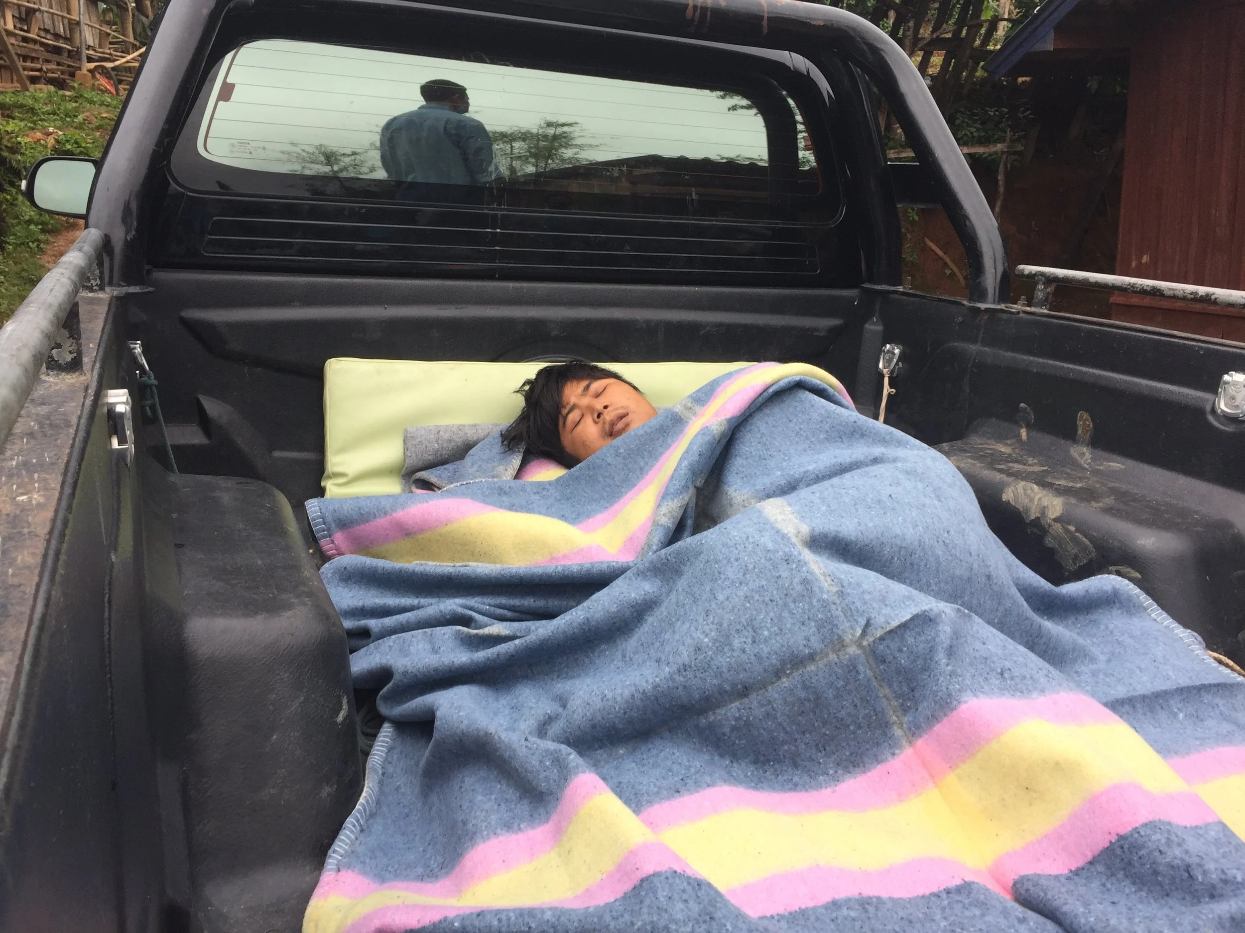 I first met NewPoe in mid April. He came to my clinic all swollen up. I was very concerned because he was only 27 years old and now he has kidney failure. The man with him assured us that he would take him to Meta hospital. But we found out 2 months later that NewPoe never went to the hospital and now he was very sick at the point of death in CooDooMai village. He could not take care of himself and nobody wanted to take care of him. Nobody wanted him anywhere near them. Somebody had built a crude shelter for him out of tarpaulin outside of the village. Rice was brought to him occasionally.