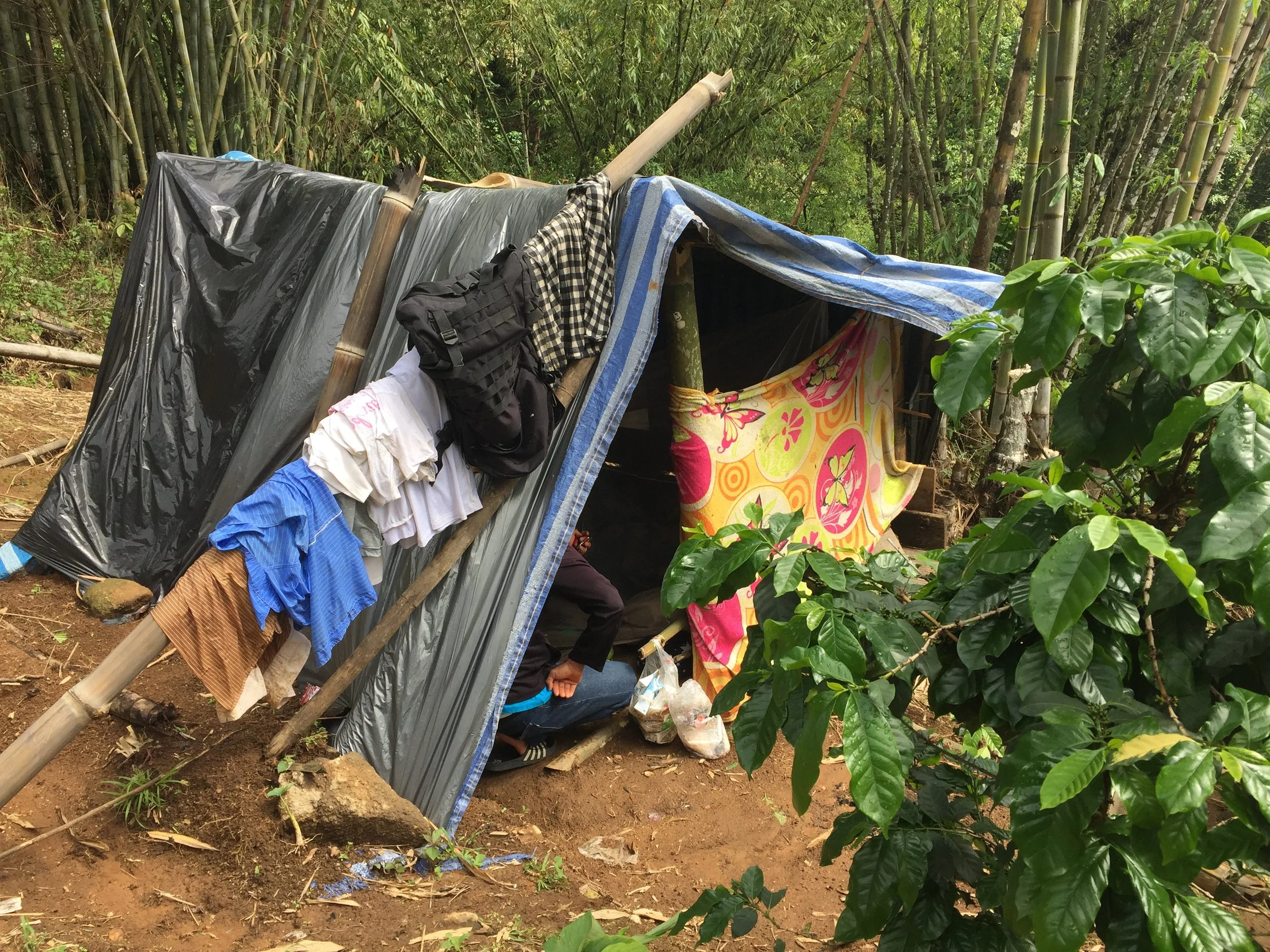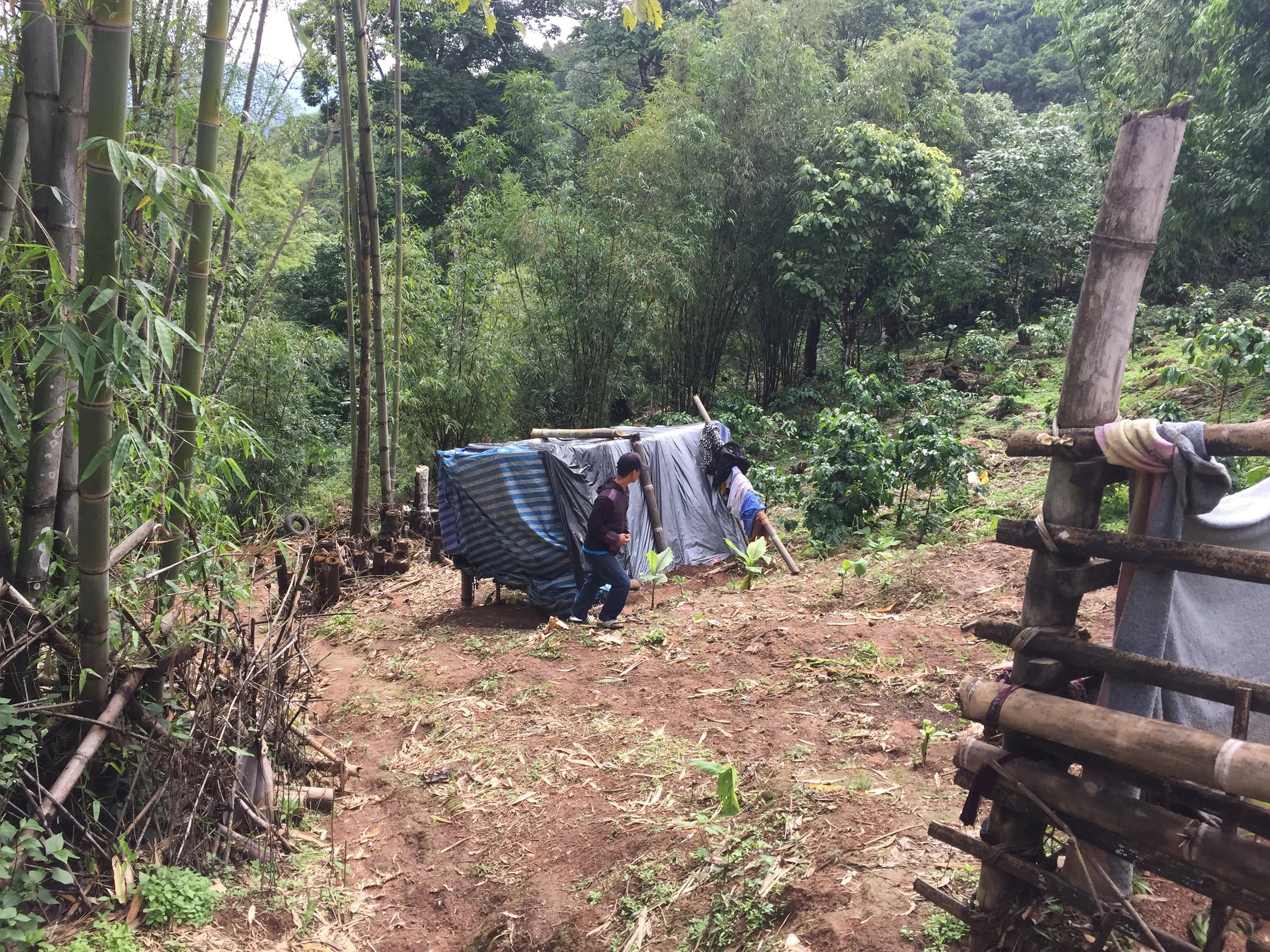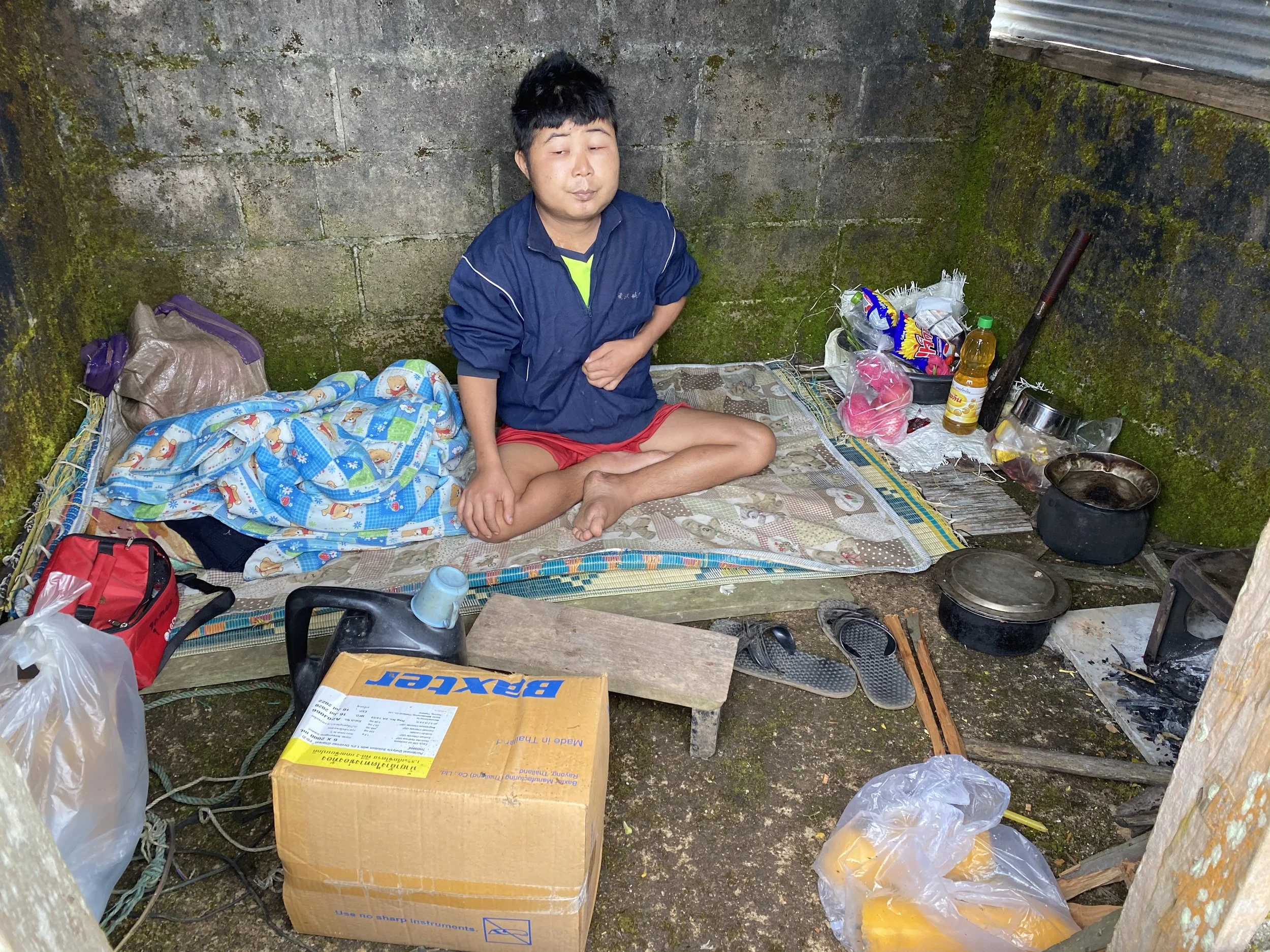 His history: When NewPoe was a very little boy, his parents both died from opium abuse. He lived with his aunt for a while, but became friends with a boy in GeGhah village, whose parents were kind to him, took him into their home and bought him a Thai citizenship card. He stayed with them for some time, but was a very naughty, unappreciative boy. Like his biological parents he became addicted to opium and other harsh, jungle drugs. He did not attend school, but was drafted into the army where his naughty behavior got him into trouble. He could not understand the Thai language, therefore the sergeant did not like him. Finally he left AWOL from the army, which is a serious offense, punishable by fines and jail time. So he is hiding and using drugs, and is selfishly, all-around, naughty. After we heard about his deplorable condition in CooDooMai village, we went to visit him and evaluate his condition. It was now mid-June. I could smell it from far away! Down the mountainside was a crude shelter made of tarp. There he lay in his own filth. It was a horrible sight and a place for only the strongest stomachs to enter!