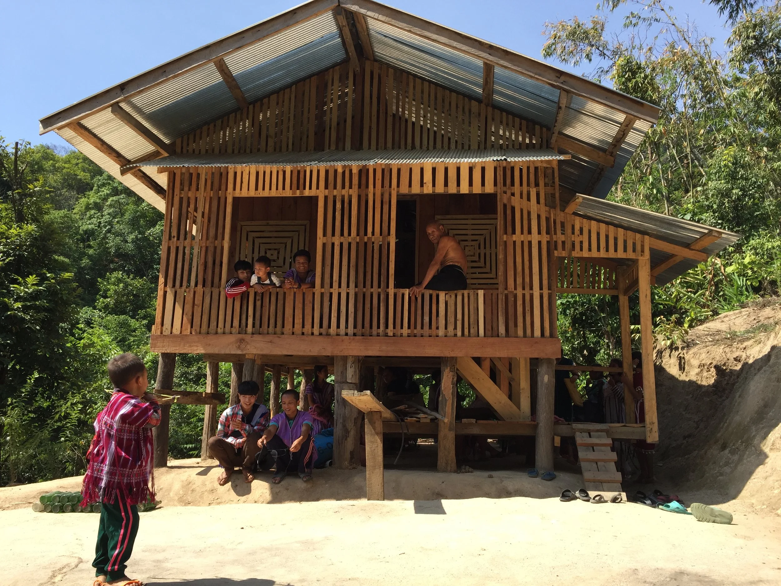 So, the materials came into MDK, the builders and others helped carry heavy things from where our truck parked, all the way up to the building site. The village young men took cement bags etc., loaded them on their motorbikes and hauled them up, trip after trip after trip. It takes almost 4 hours to drive into MooDooKee village with heavy building materials. It took us 21 trips to build that little church.