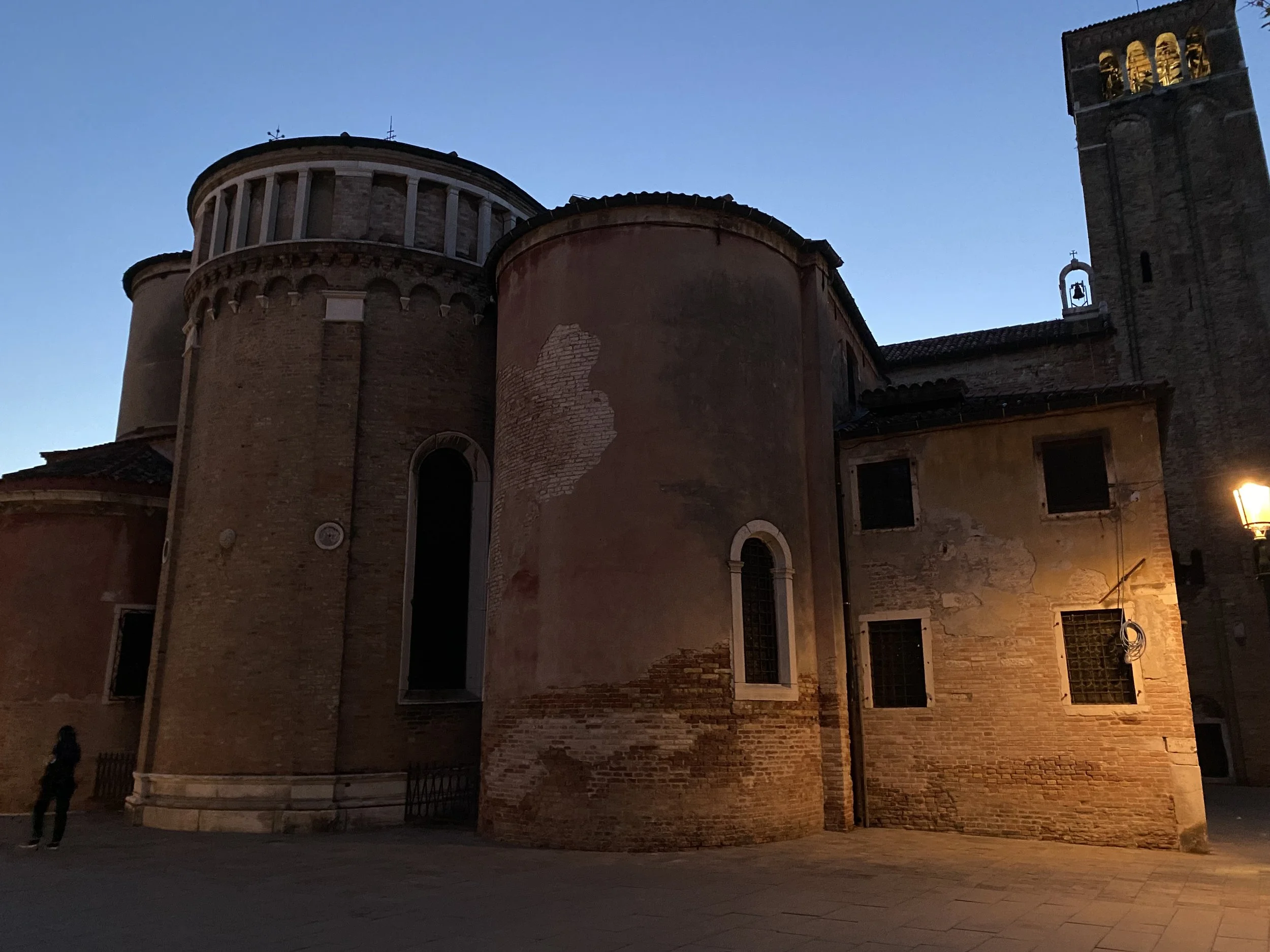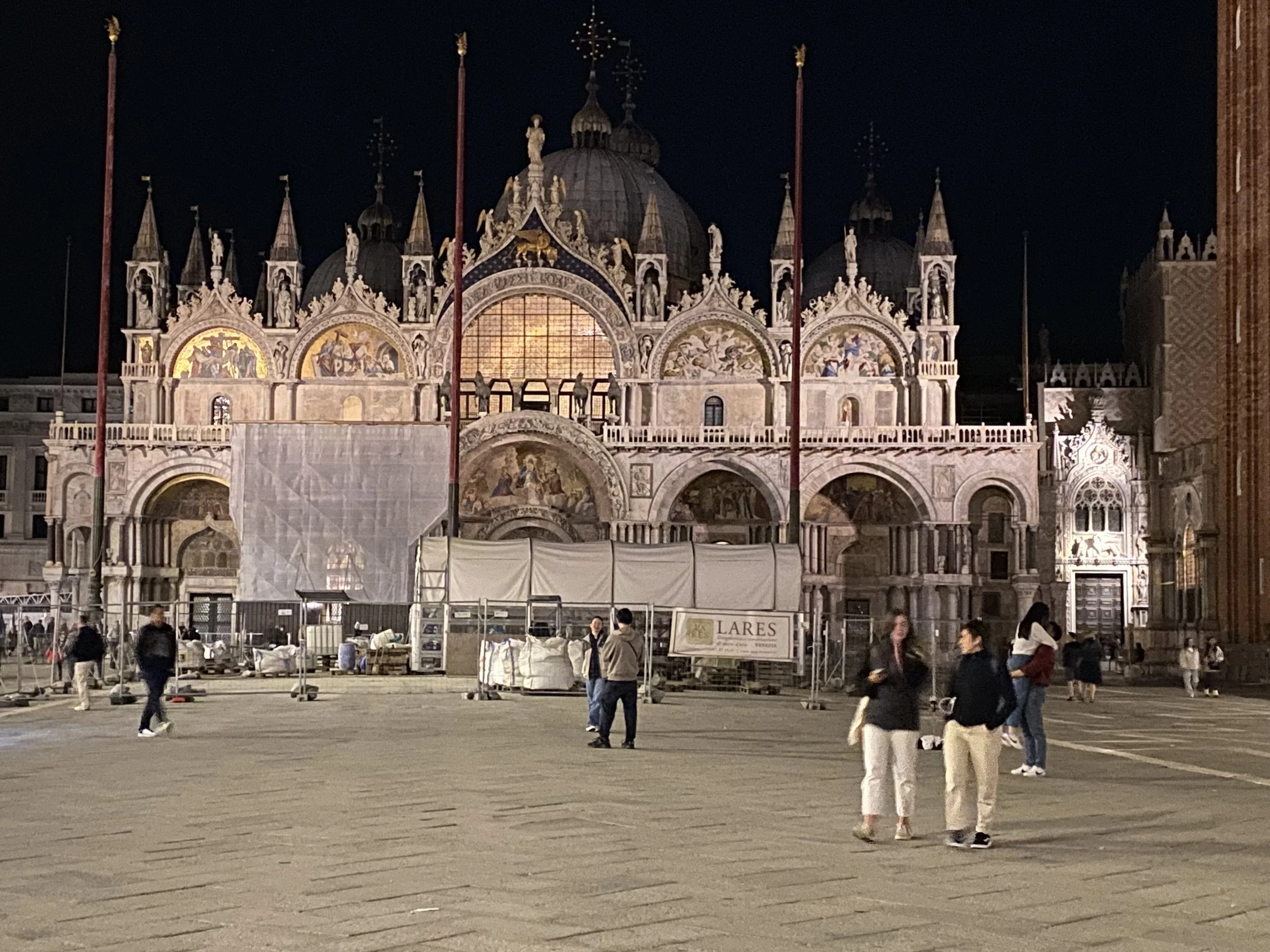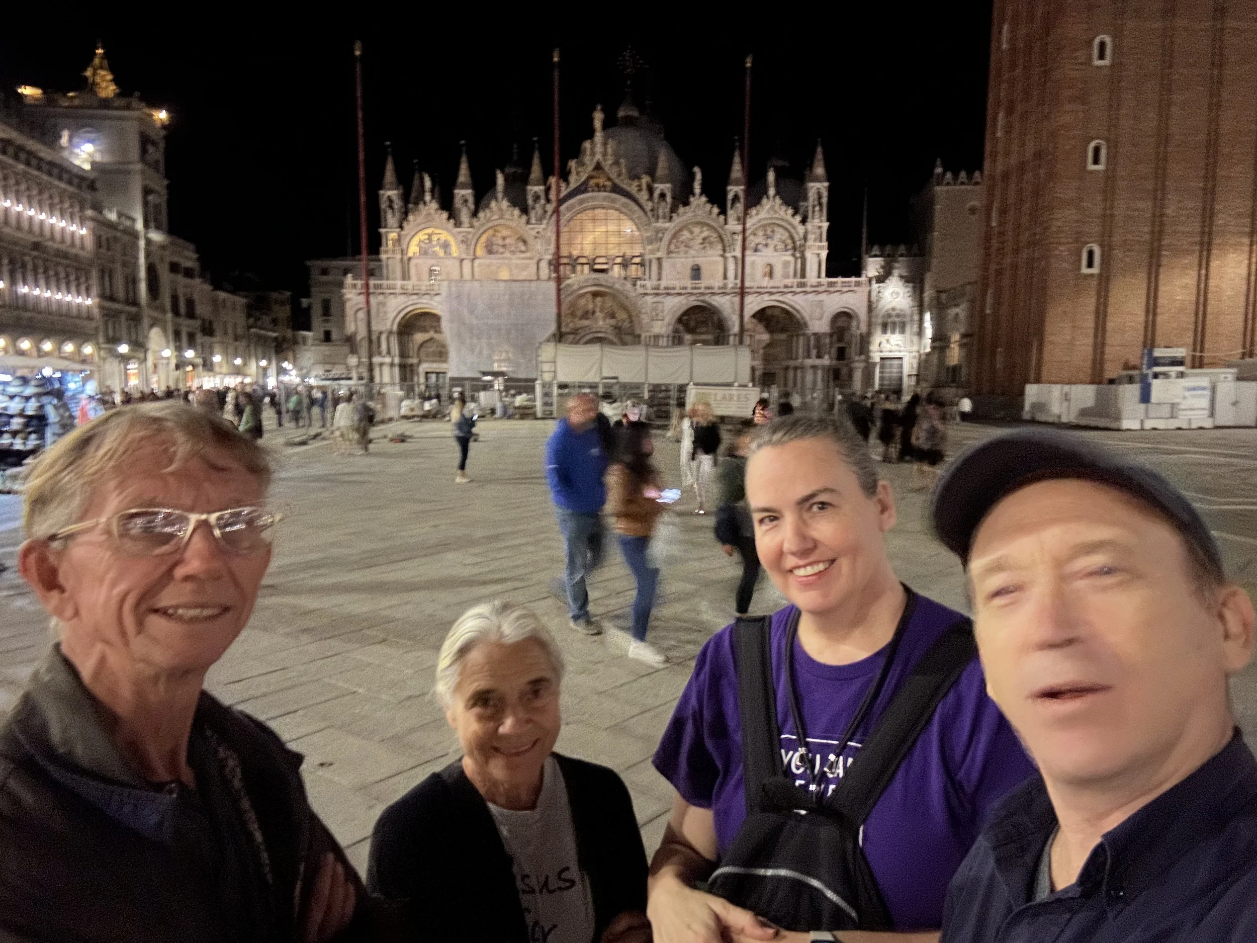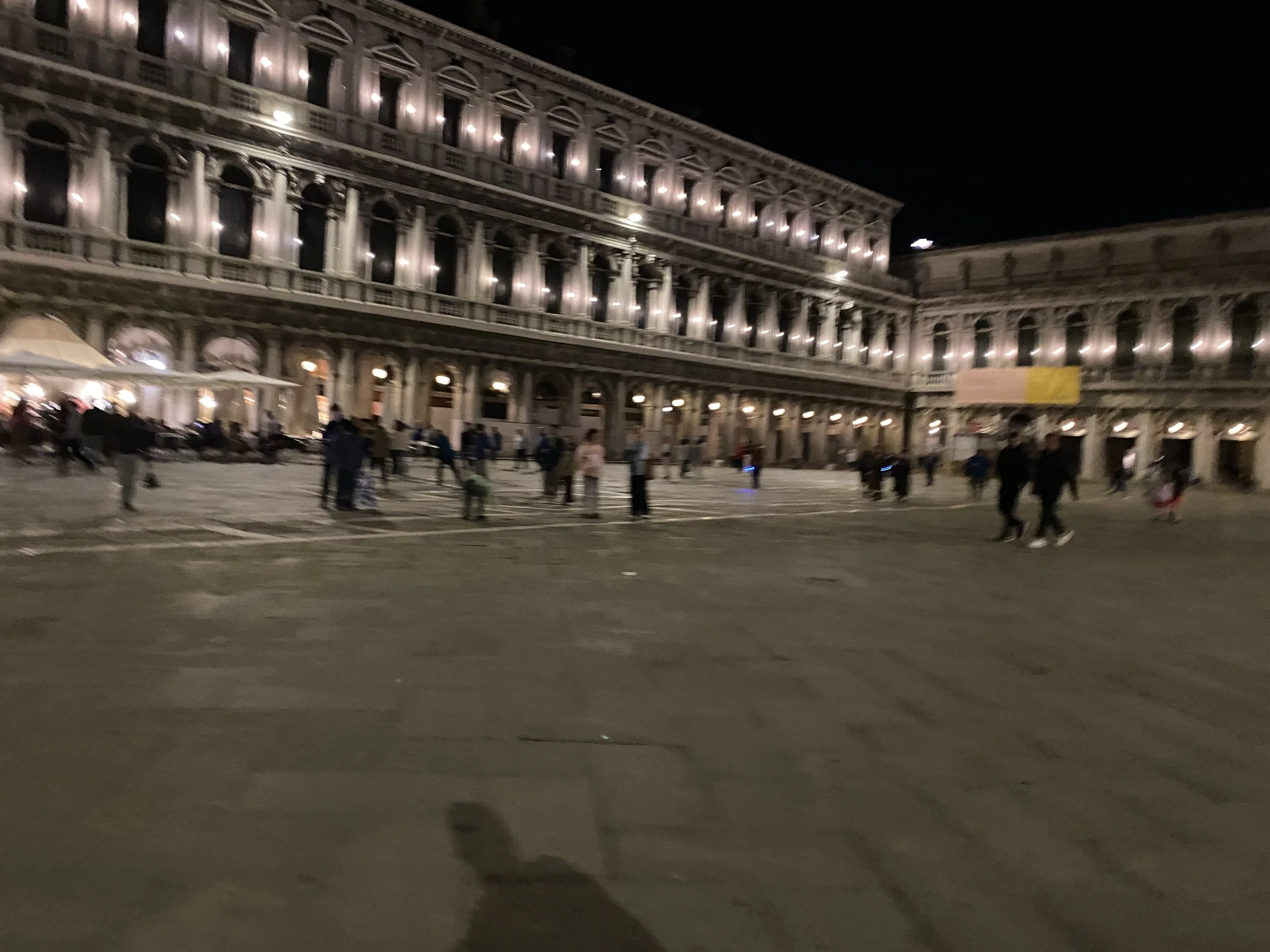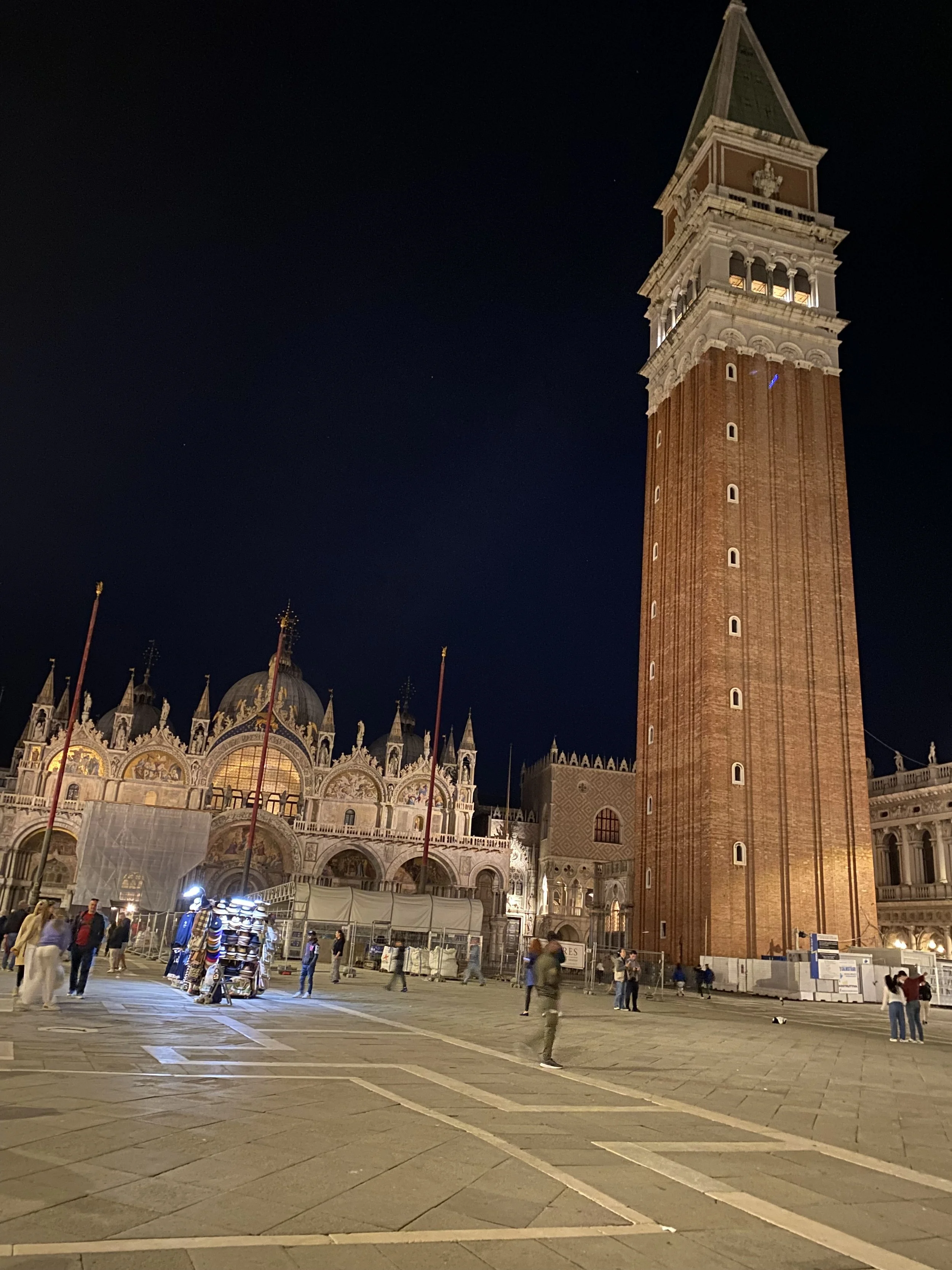 Night had fallen by the time we reached St. Mark’s Square. At one end was a huge cathedral, next to that a tall tall tower, and all around the large square were lines of big buildings.